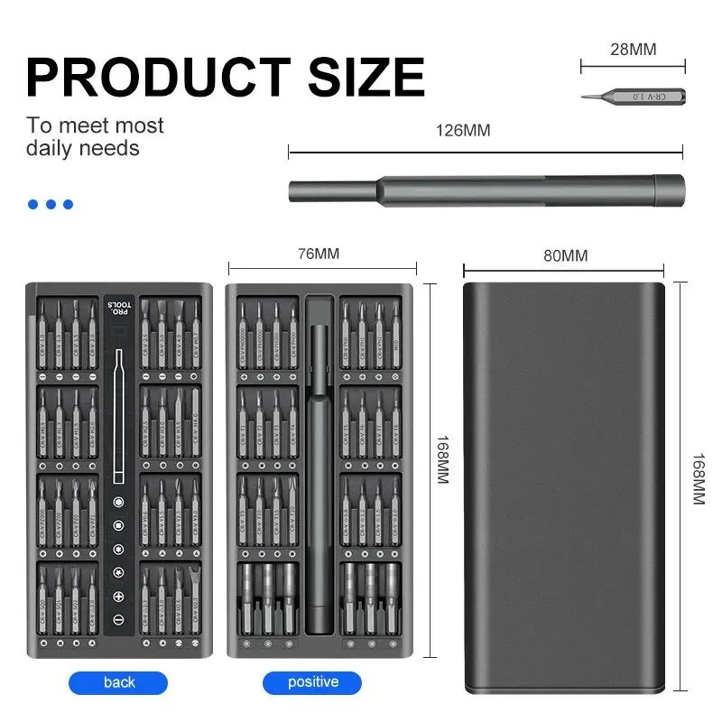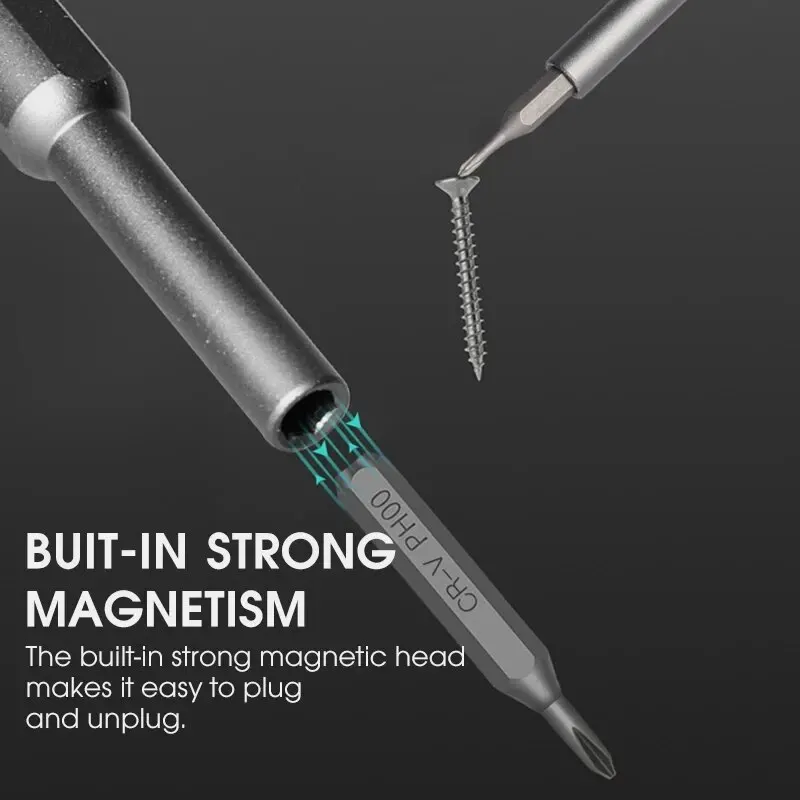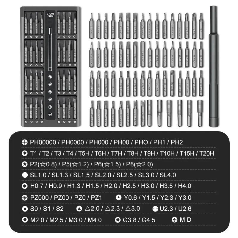 【Pop-Out Case Design】The electronic screwdriver set case has a built-in eject button, which pops out the inner contents with a gentle press for easy access to your precision bits. The magnetic screwdriver case is made of PC+ABS high-class plastic and the computer tool kit features a magnetically secured box that keeps all the bits in place. The arrangement is designed accordingly, the card position is consistent, and every bit is engraved with a part number and size for fast recognition.