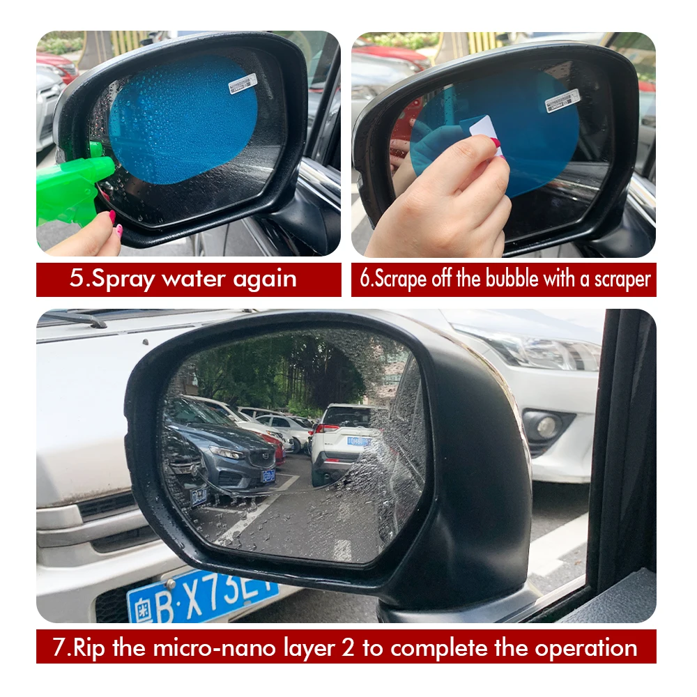 -Use the clean cloth in the package to clean the dust and dirt of the mirror, and sprinkles some water or spray some alcohol before applying the rear view mirror waterproof film, attach the protective film to the mirror and paste it, use the scraper to clean the water and air inside