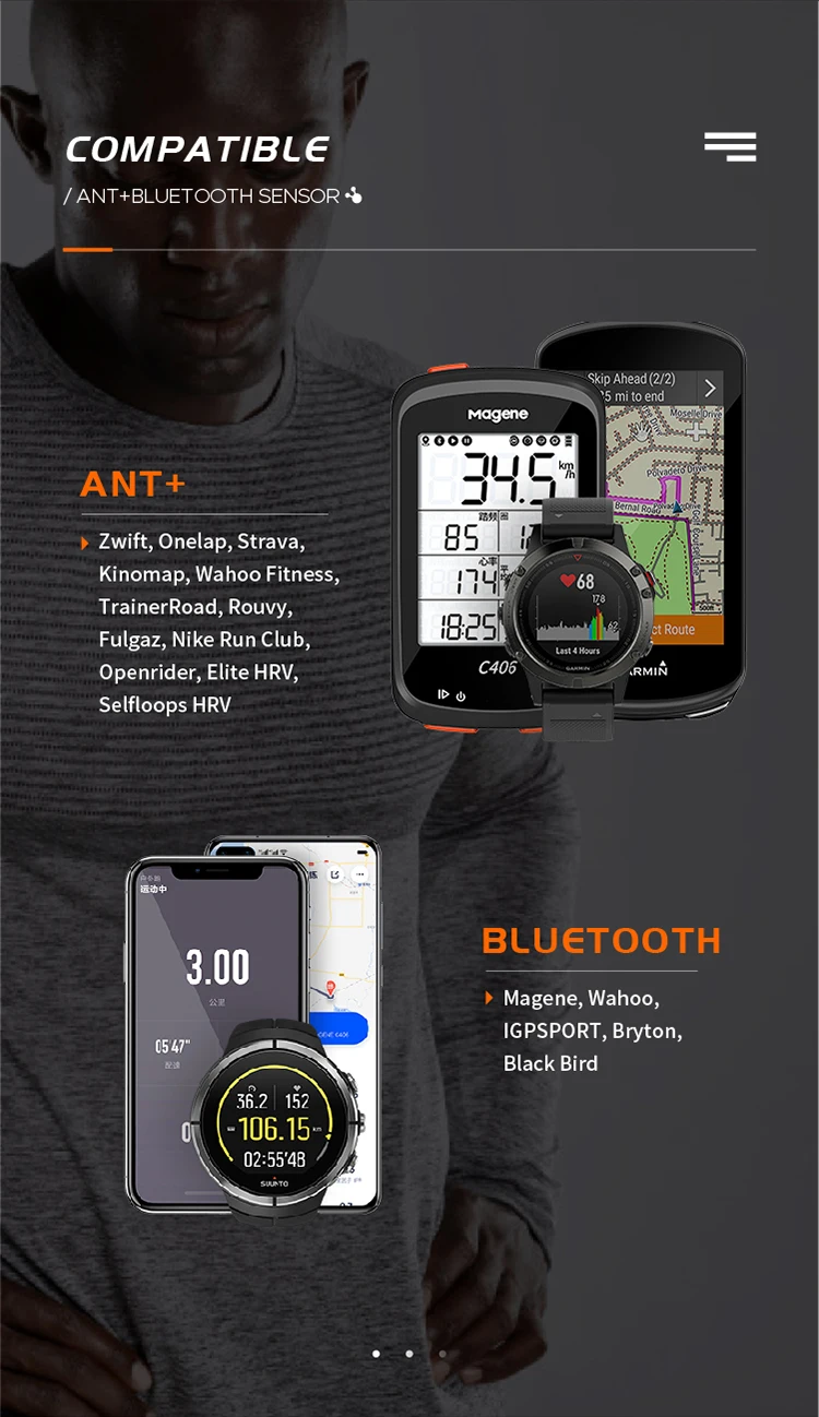 • Compatible ANT+&Bluetooth: 2 data copies for 1 workout, recording via ANT+ device and Bluetooth App at the same time, with the stable transmission. ANT+: Magene, Wahoo, IGPSPORT, Bryton, Black Bird. Bluetooth: Zwift, Onelap, Strava, Kinomap, Wahoo Fitness, TrainerRoad, Rouvy, Fulgaz Nike Run Club, Openrider, Elite HRV