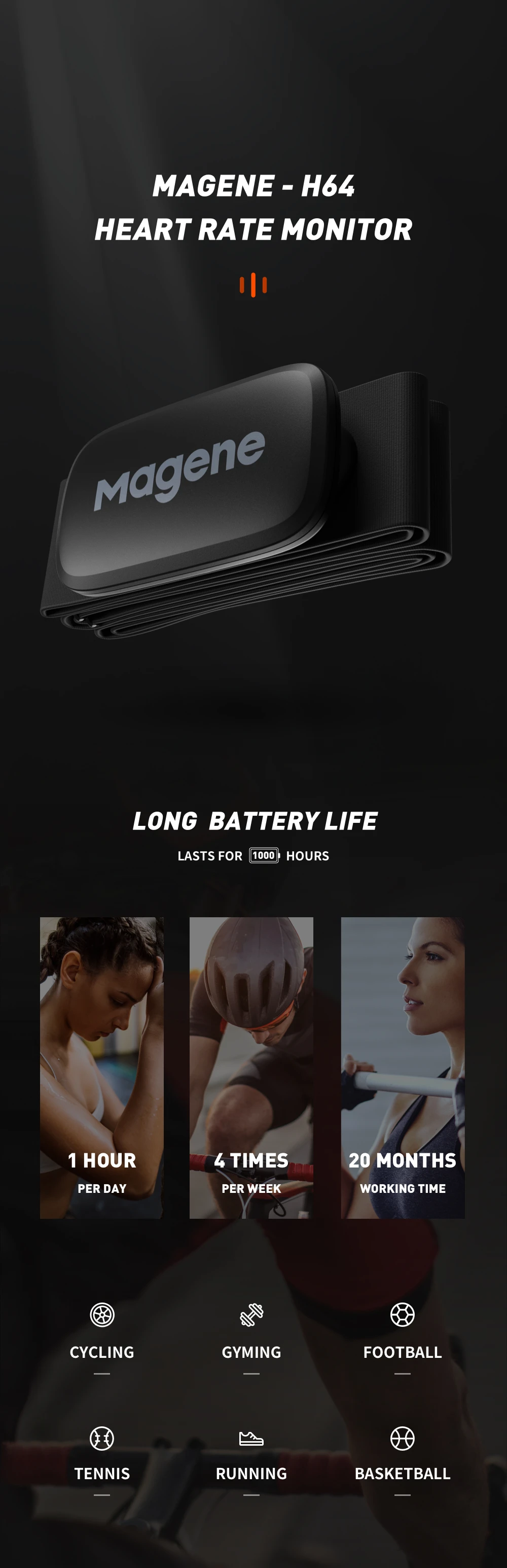 • Versatility: Made from durable, wear-resistant materials that won’t break, or tear. IP67 water resistance but not for swimming. The Magene H303 heart rate monitor can be used in almost all sports such as cycling, fitness, soccer, tennis, running, basketball, etc.