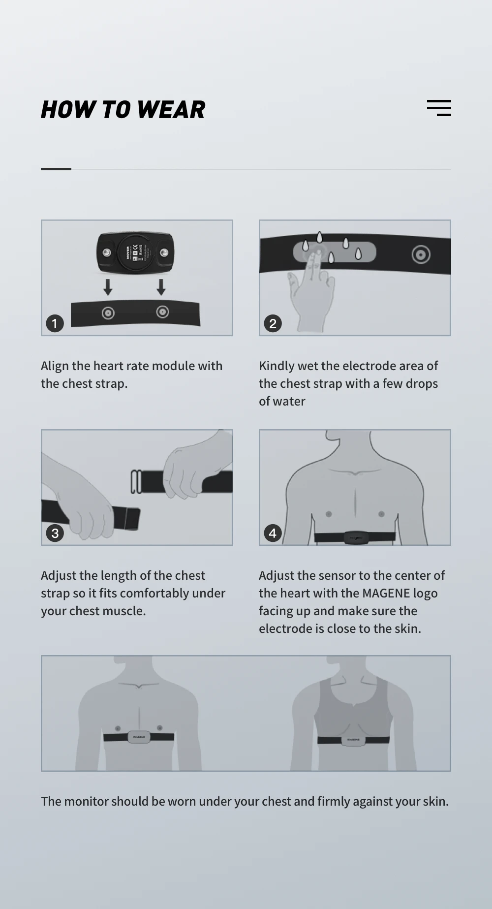 1.Dip the heart rate band with a small amount of water before wearing it