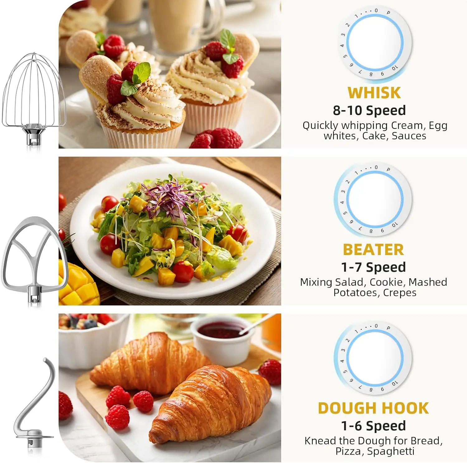 - One-button Release Tilt-head: Compact design with tilt-head allows the attachments (dough hook, wire whip, flat beater) nicely reach the bottom of the bowl for mixing thoroughly. Adjustable arm lift button solid connecting design with safety switch for mixer.